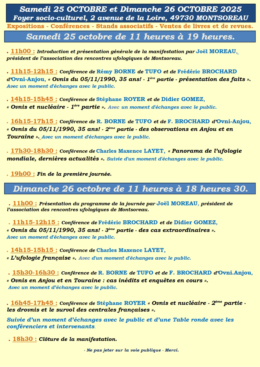 Frédéric Brochard (Ovni Anjou) et Didier Gomez présentent pour la 4 ème Rencontre Ufologique de Montsoreau (49), la célèbre vague d'ovnis du 05 novembre 1990 avec une sélection de cas extraordinaires. Suivie d'un moment d'échanges avec le public.